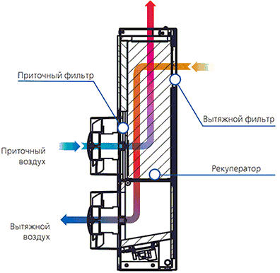 Принцип рекуперации основан на использовании тепла удаляемого воздуха для нагрева приточного воздуха. Процесс передачи тепла происходит в теплообменнике (рекуператоре), где теплый вытяжной воздух отдает большую часть своего тепла приточному свежему воздуху, что существенно уменьшает потери тепловой энергии в холодный период года.